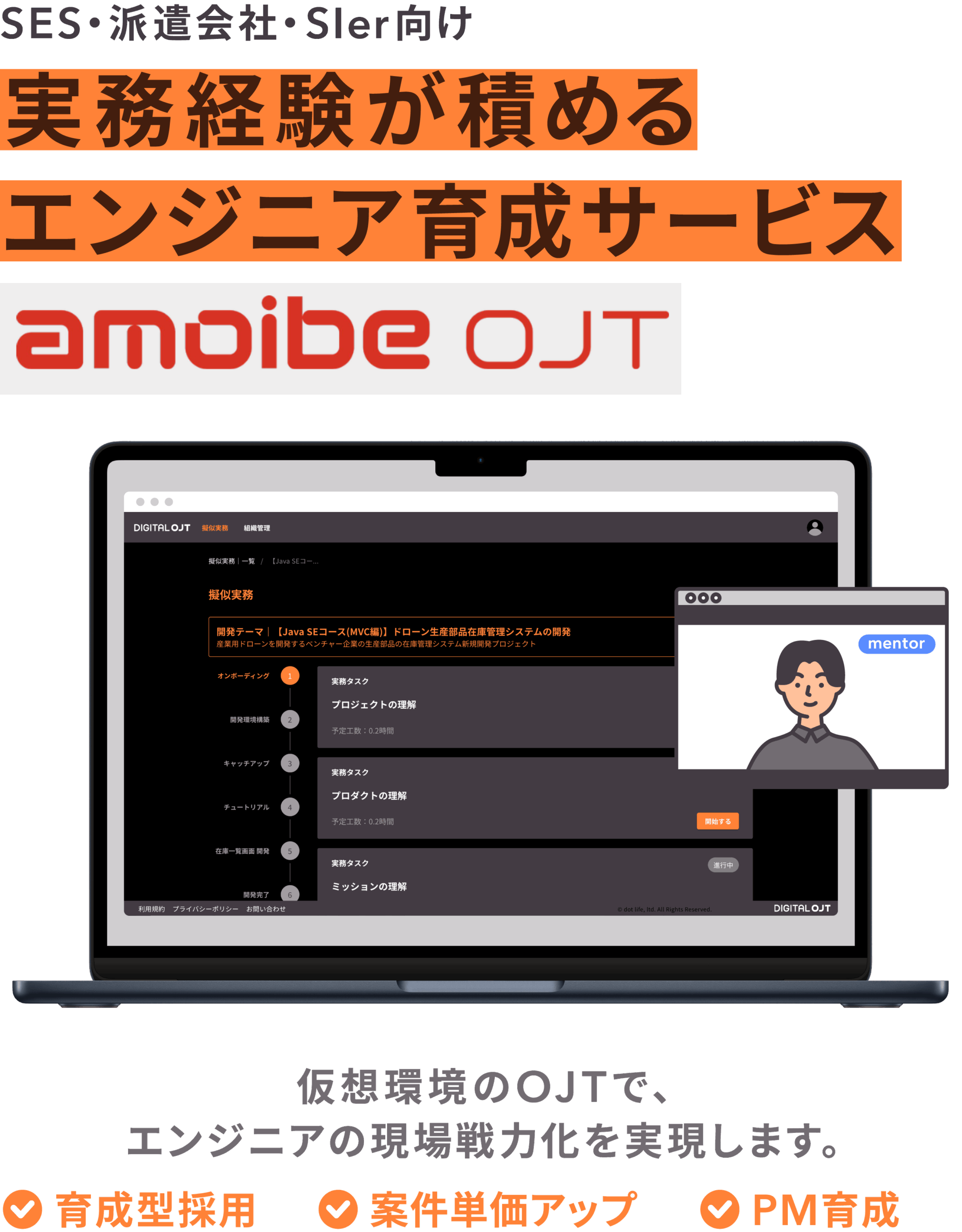 エンジニアの採用環境は厳しくなり、未経験・微経験の育成やPM育成・リスキリングなど、エンジニアの単価向上やキャリアアップは大きな課題となっています。『amoibe OJT』は、デジタル環境上で実務を再現した[擬似実務]により、利用者が経験すべき「はじめての業務工程」を経験することが可能です。さらに、“仮想上司”として伴走支援・細やかなフィードバックを提供する[メンターサポート]により、エンジニアの効率的な成長を支援します。